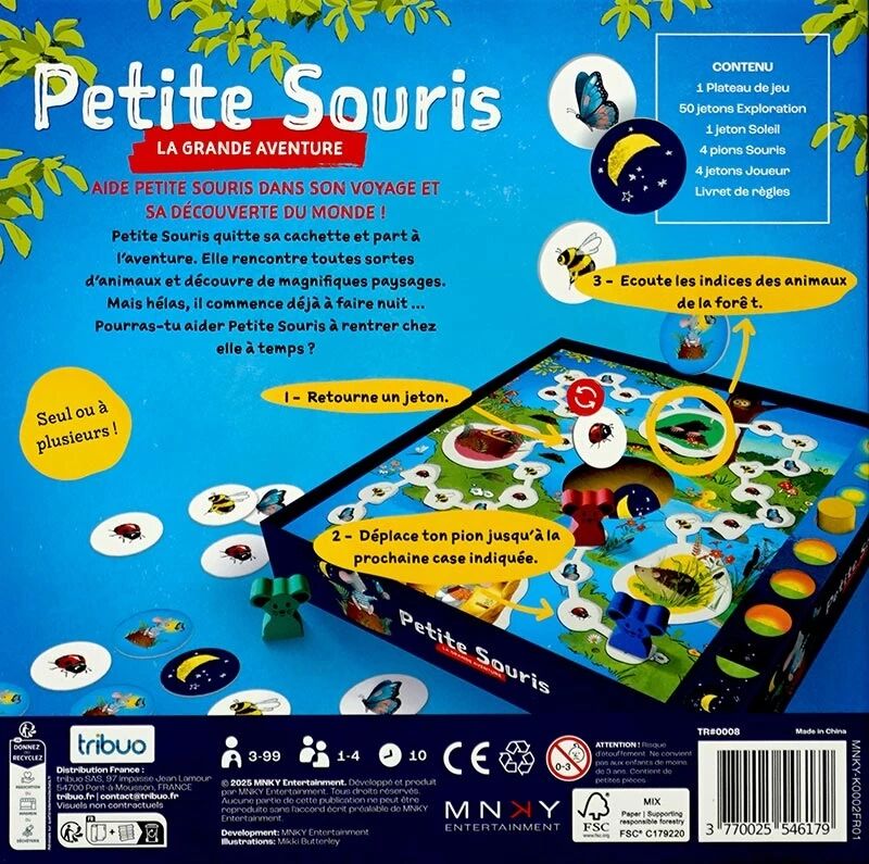 Dans le jeu Petite Souris : La Grande Aventure, les joueurs aident une adorable petite souris à quitter sa cachette pour partir à la découverte de la grande forêt. Tout au long de son voyage, elle rencontre de nombreux animaux, traverse des paysages colorés et apprend à se repérer avant que la nuit ne tombe. L’objectif est simple : être le premier à ramener Petite Souris à la maison… ou coopérer pour que tout le monde arrive à temps.