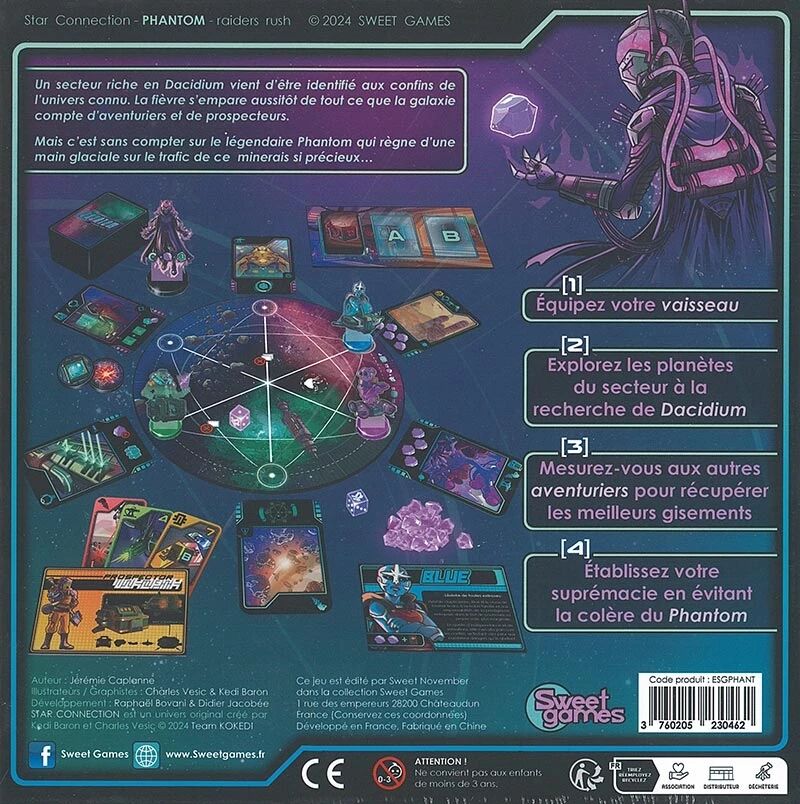 1 carte stellaire recto-verso, 1 dock de chargement, 52 cartes Équipement, 50 cartes Aventure, 5 fiches Aventuriers, 5 pions Aventuriers + 1 pion Phantom + socles, 2 jetons (Bloulopode et Mine dérivante), 2 dés spéciaux, 72 cristaux de dacidium