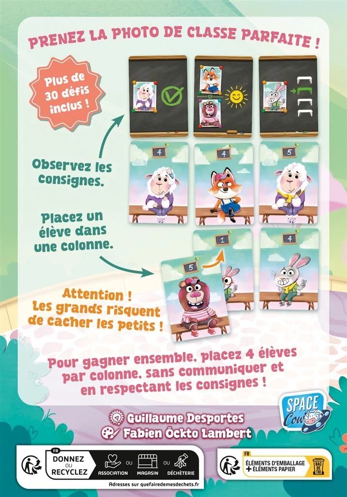 Photo de Classe propose plus de 30 défis évolutifs, permettant de renouveler vos parties et d’augmenter progressivement la difficulté. C'est un excellent jeu familial, accessible et intelligent, qui développe la logique, la communication non verbale et l’esprit d’équipe.