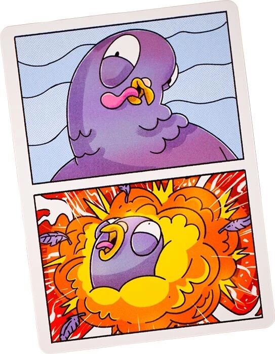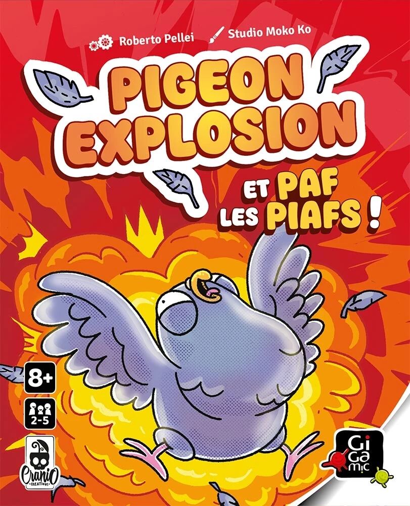 Pigeon Explosion est un jeu de cartes pour 2 à 5 joueurs. Dans ce jeu d'ambiance délirant, vous devez nourrir vos pigeons pour les rendre heureux… tout en gavant ceux de vos adversaires afin de les faire exploser. Usez et abusez de coups bas, cartes surprises pour provoquer des explosions en chaîne et remporter la partie.