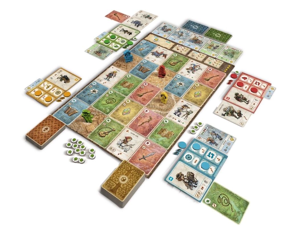 64 cartes Objets, 32 cartes Compagnons, 20 cartes Aventures de niveau I, 17 cartes Aventures de niveau II, 12 tuiles Quêtes publiques, 1 jeton Soleil, 26 jetons Trèfles, 1 plateau, 1 plateau individuel par joueur, 1 tuile Aide de jeu par joueur, 1 tuile Voyageur par joueur, 1 pion Voyageur par joueur, 2 jetons Plumes par joueur, 3 disques par joueur, 17 cartes Périples, 12 jetons Périples, 1 plateau solo, 2 pions Voyageurs, 2 jetons Plumes, 12 cartes Solo, 1 livret de règles.