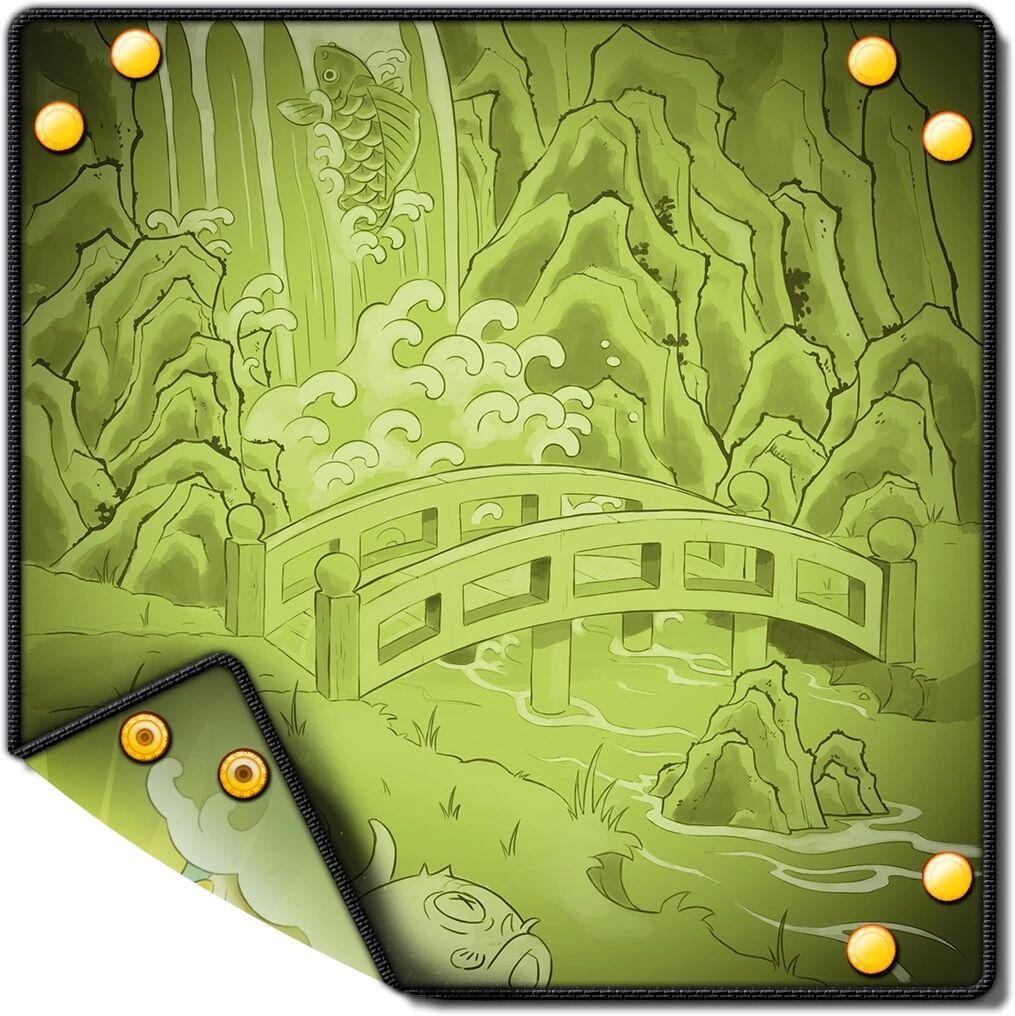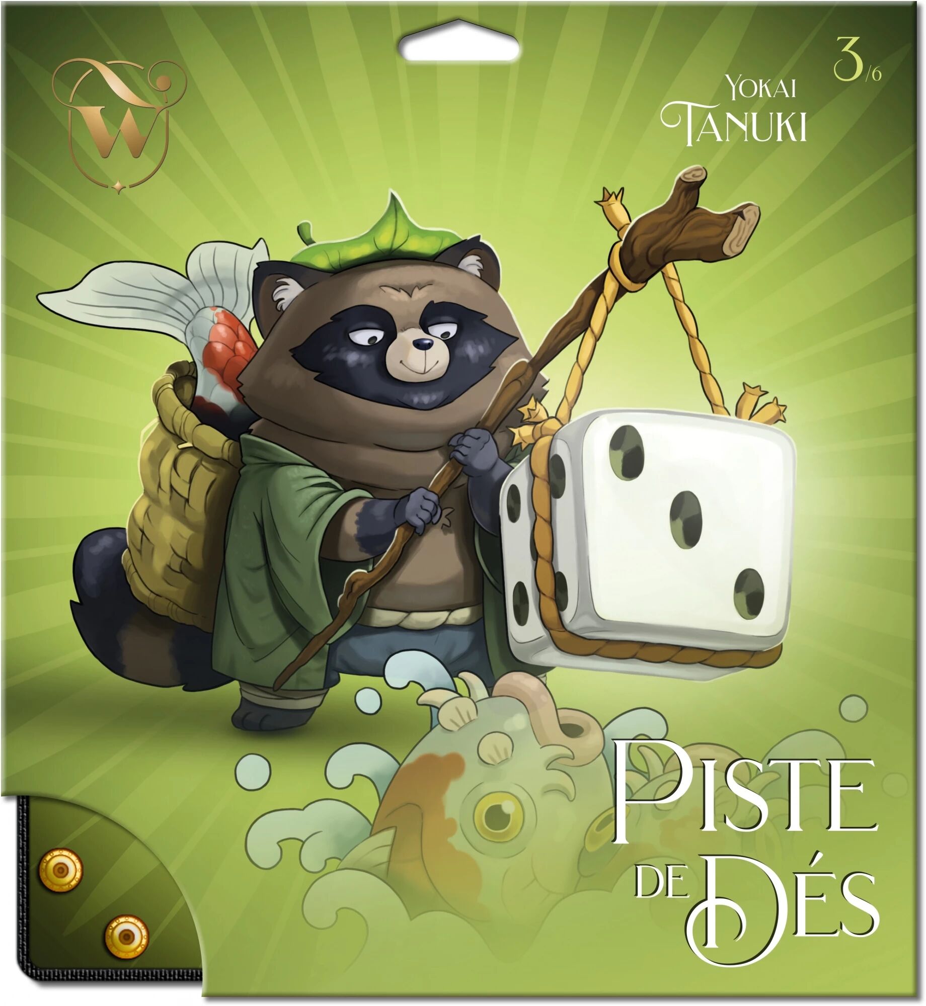 Esprit farceur, ce Tanuki n'en est pas à son coup d'essai. Son air est tranquille, presque amusé : il sait qu'il finira par appâter une belle carpe avec son dé. Il suffit d'attendre son heure, parce qu'il est malin. Ce n'est pas lui qui tente sa chance, mais les carpes joueuses attirées par ce dé luisant, comme la clef de leur destin. L'une d'elles finit dans son ventre rebondi. Tandis que l'autre a su se faufiler à contre-courant. Nul ne sait si elle parviendra à remonter jusqu'à la naissance de la cascade pour se transformer en dragon. Il lui faudra plus que la chance offerte par le Tanuki. Pour l'heure, celui-ci est occupé à préparer son prochain tour...