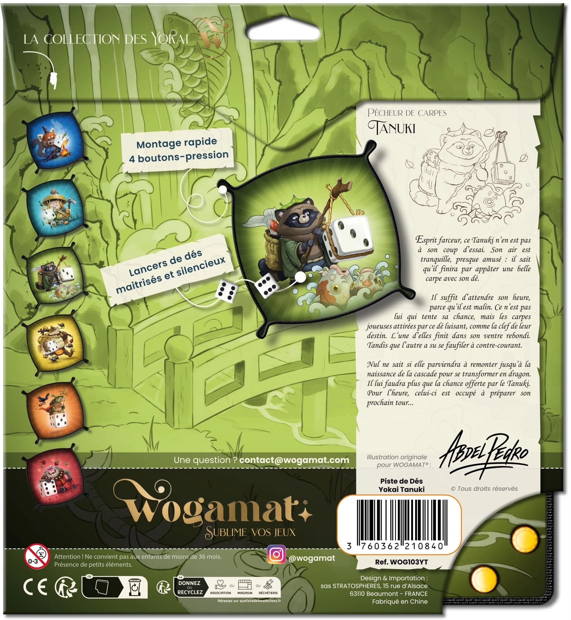 Illustrateur devenu tatoueur, Abdel Pedro est un véritable conteur d’histoires visuelles. Il développe un univers cartoon et néo-japonais, coloré et plein d’humour. Chaque création cherche à provoquer le sourire et à transmettre une énergie positive. Pour la collection Yokai Deluxe, il a imaginé des personnages facétieux, prêts à faire déborder de joie chaque partie de jeu. Chaque piste met en scène un Yokai unique, lié à sa face de dé favorite. Au recto, le Yokai s’impose avec force et caractère ; au verso, un paysage illustré raconte son histoire et nous permet de découvrir son monde.