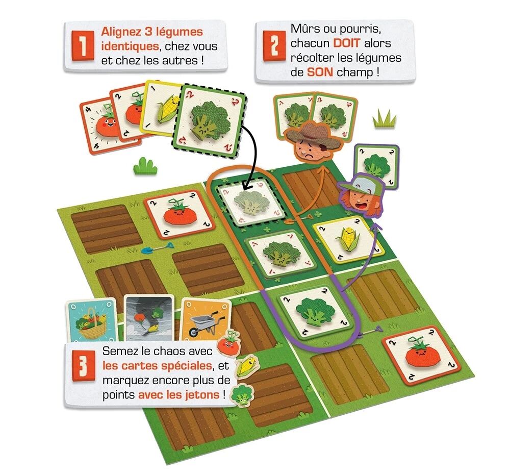 À votre tour, vous jouez une carte Légume de votre main et la plantez sur n’importe quel emplacement vide, chez vous ou chez un adversaire. Dès qu’un alignement d’au moins trois légumes identiques apparaît (en ligne, colonne ou diagonale), une récolte est immédiatement déclenchée. Chaque joueur récupère alors les légumes de son champ concernés, tandis que celui qui a provoqué la récolte gagne un précieux jeton Légume, essentiel pour marquer des points bonus en fin de partie.