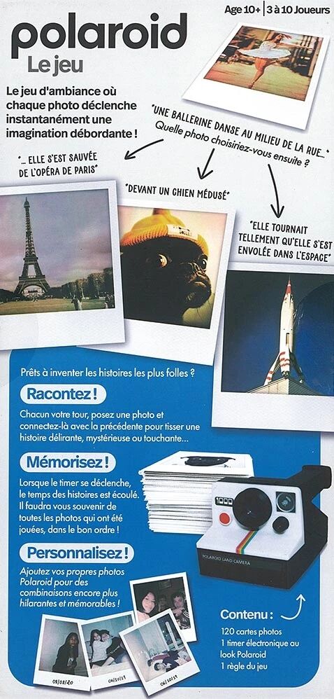 120 cartes photos, 1 timer électronique au look Polaroid (nécessite 2 piles AAA non incluses), 1 règle du jeu