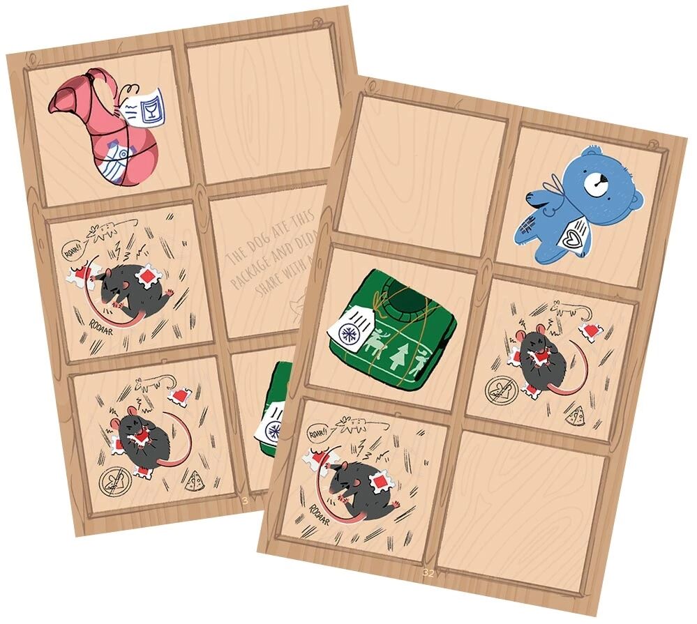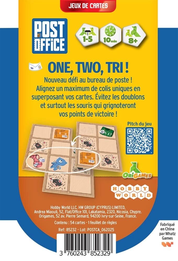 Bienvenue dans notre bureau de poste original, peuplé d’animaux savants. Vous voilà au cœur du centre de tri : à vous d’optimiser le rangement des colis. À chaque manche, agencez vos 2 cartes Colis pour chasser les souris et aligner astucieusement des objets différents. Serez-vous à la hauteur pour devenir l’employé·e du mois ?