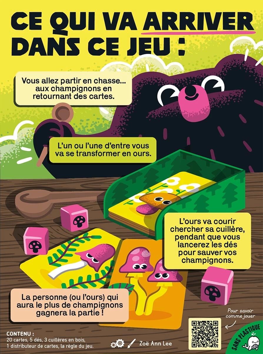 L’ours sprinte pour aller chercher une cuillère placée à distance, pendant que les autres lancent frénétiquement leur dé Champignon pour récupérer un maximum de cartes visibles. Chaque face Champignon obtenue permet de saisir une carte et de l’ajouter à sa réserve. Mais attention : dès que l’ours revient avec la cuillère, il rafle toutes les cartes encore disponibles sur la table !