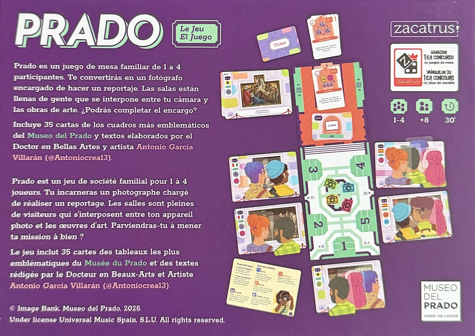 Prado est un jeu de stratégie accessible qui combine observation et planification. Chaque décision modifie la configuration des salles et peut gêner les autres photographes en quête du meilleur angle. Avec ses 35 cartes représentant des œuvres emblématiques du Musée du Prado et ses textes culturels rédigés par un spécialiste en Beaux-Arts, Prado propose une expérience à la fois ludique, culturelle et enrichissante à vivre en famille ou même en solo !