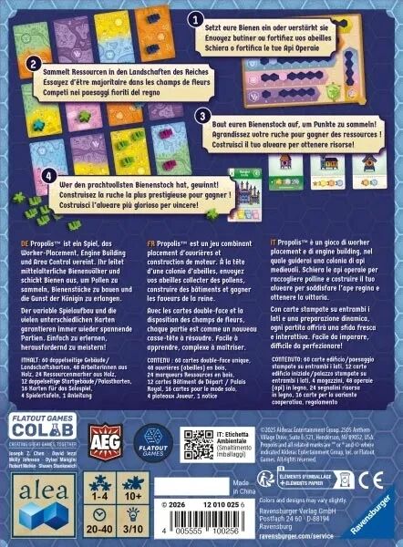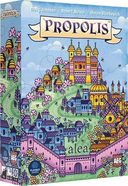 Dans le jeu Propolis, chaque joueur prend la tête d’une colonie d’abeilles ambitieuse dans un royaume médiéval luxuriant. Votre objectif : développer votre ruche en construisant des structures, en exploitant les ressources florales et en consolidant votre majorité sur les paysages pour accumuler un maximum de points de prestige.