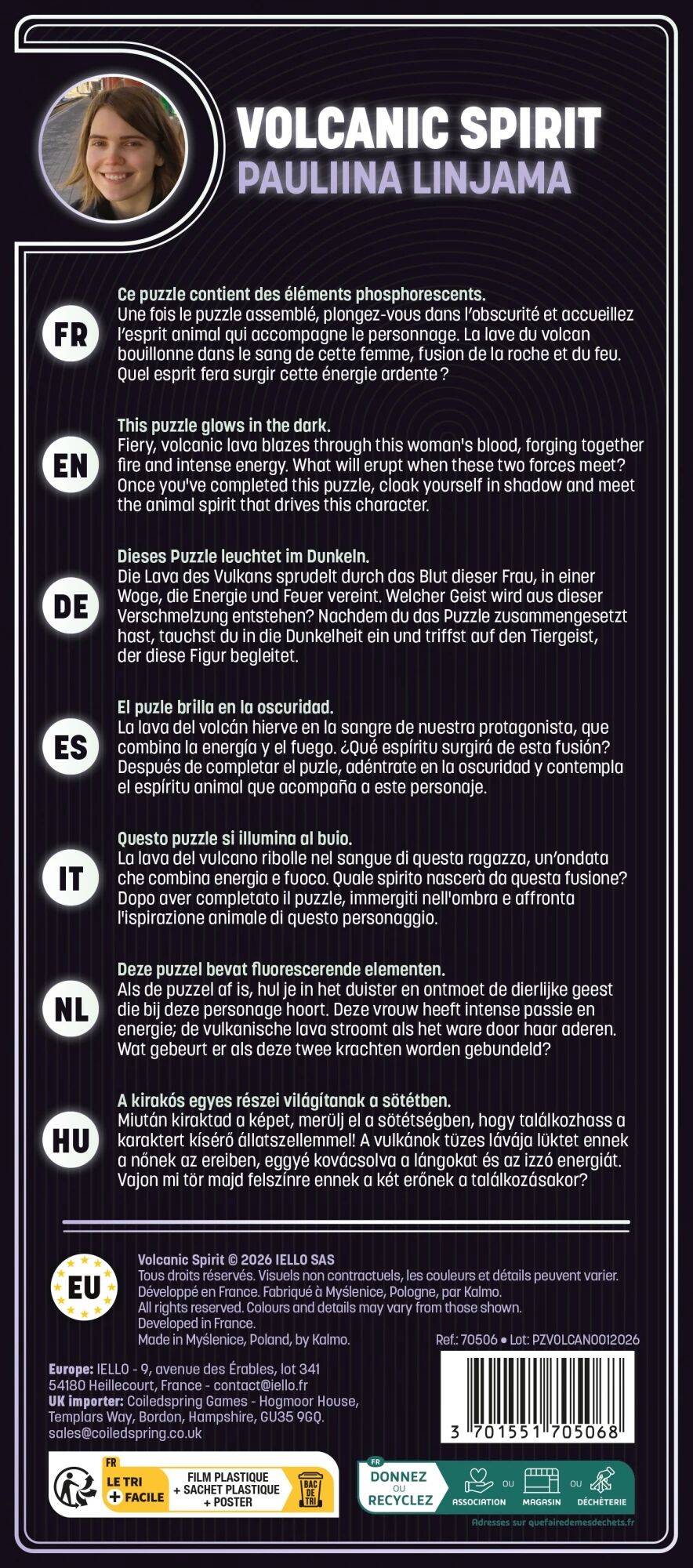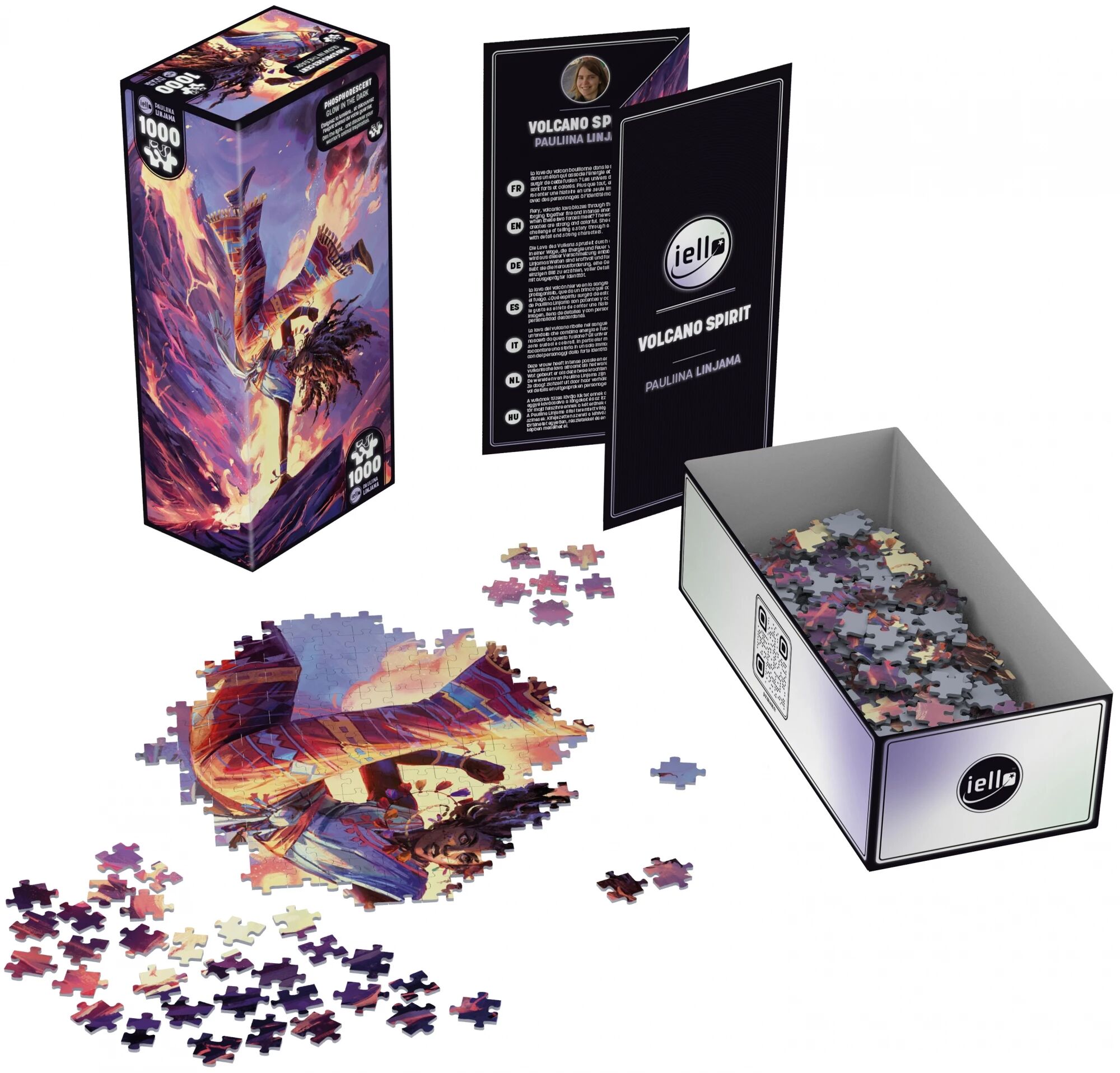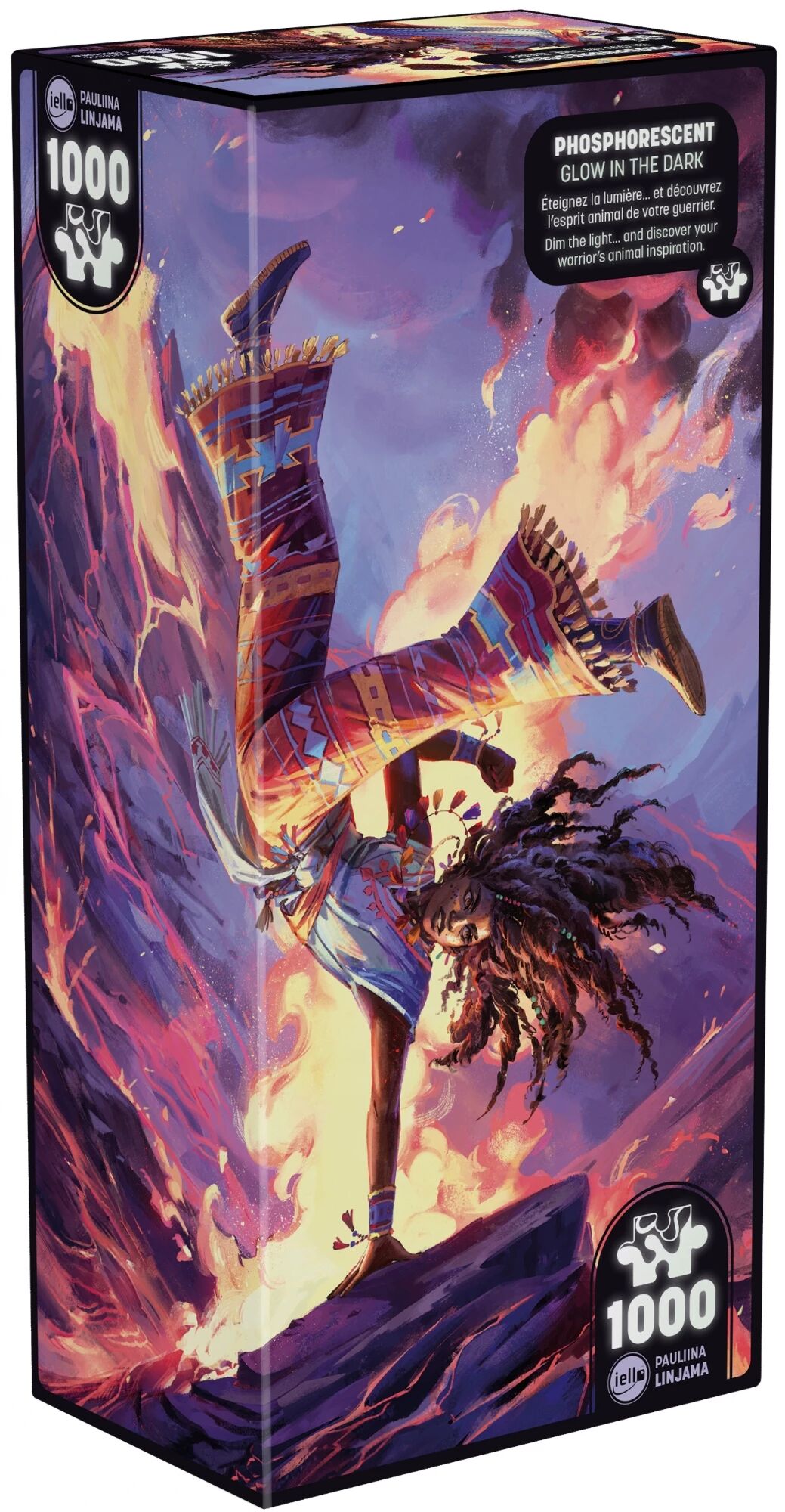 Cette collection contient des éléments phosphorescents disséminés dans l'image. Ajoutez une dimension supplémentaire à votre expérience : une fois le puzzle assemblé, plongez vous dans l’obscurité et accueillez l’esprit animal qui accompagne ce personnage.