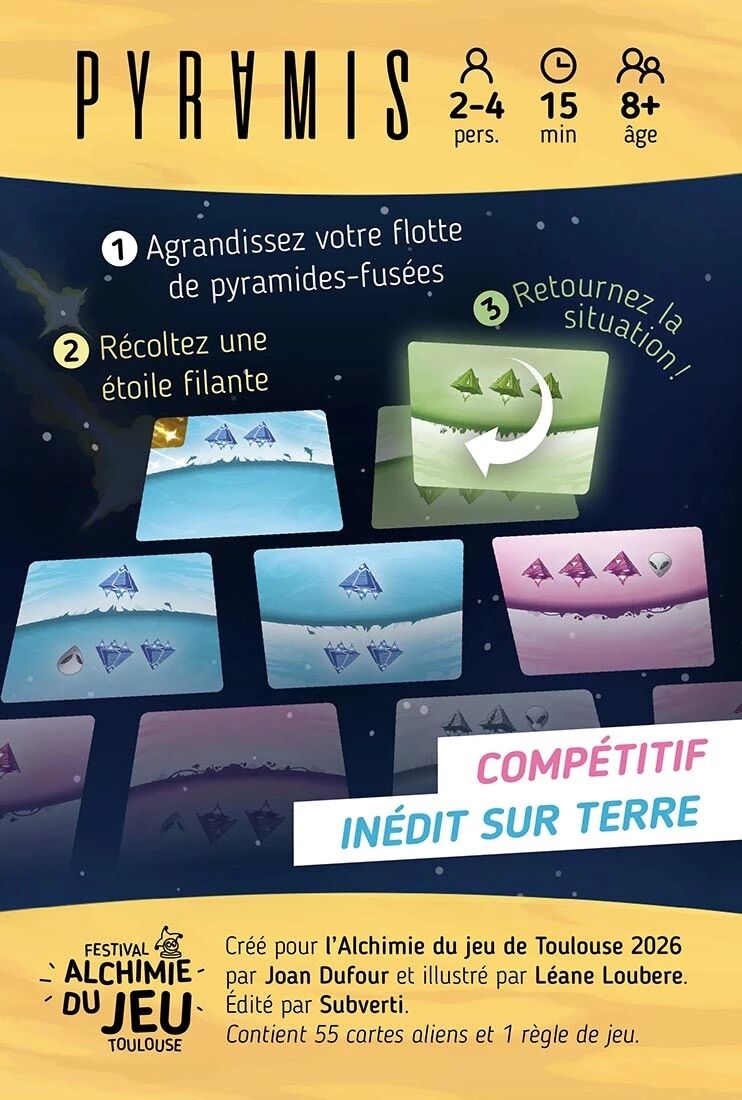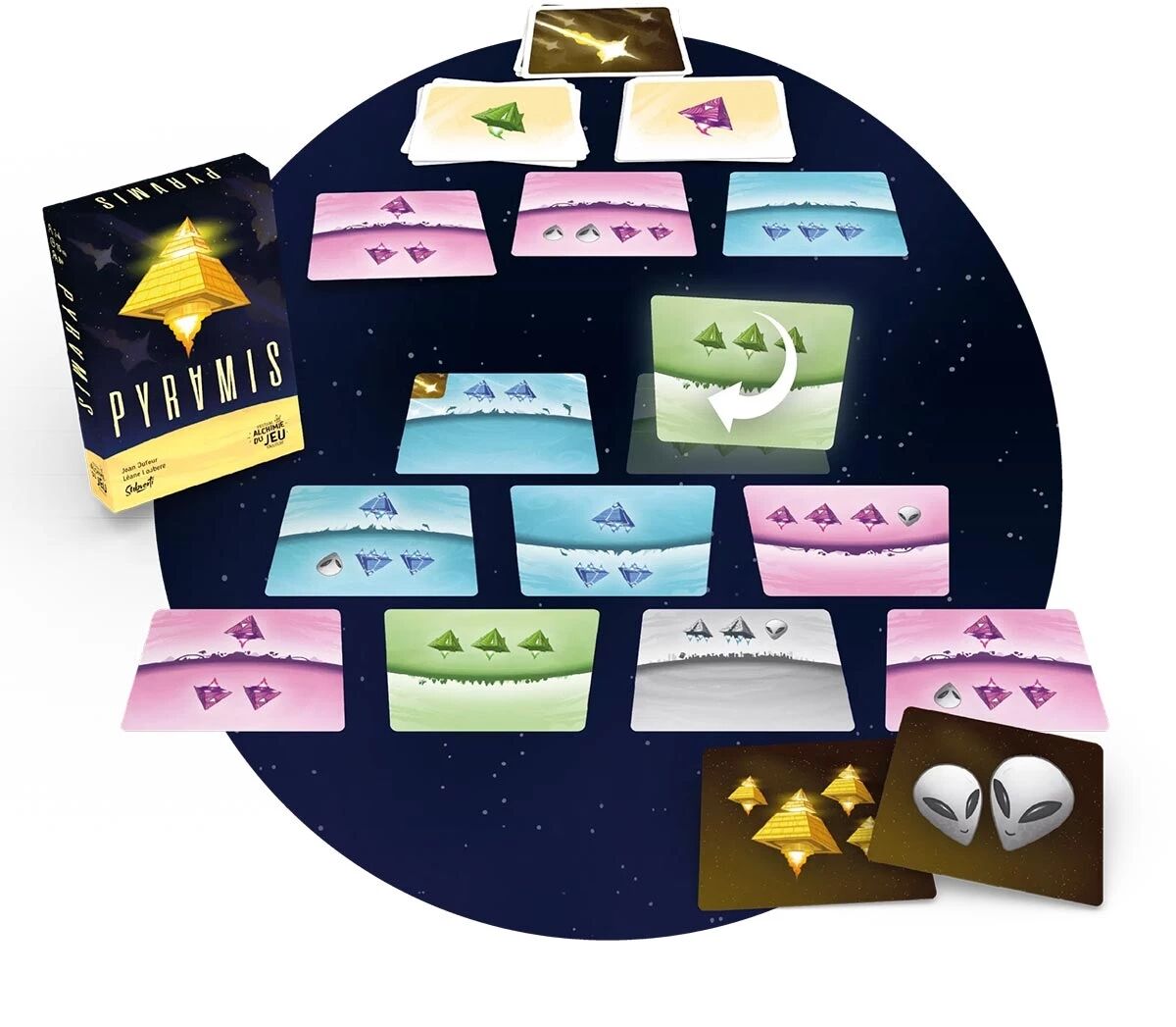 Mais Pyramis ne se limite pas à un simple jeu de placement. Les cartes peuvent être pivotées à 180°, modifiant les éléments visibles en haut de la carte, seuls pris en compte pour le score. Ces retournements, déclenchés par l’apparition de paires de pyramides de même couleur au dos des pioches, impactent tous les joueurs. À cela s’ajoutent les étoiles filantes, des cartes spéciales conservées secrètement, capables de rajouter des pyramides ou des aliens au moment le plus opportun.