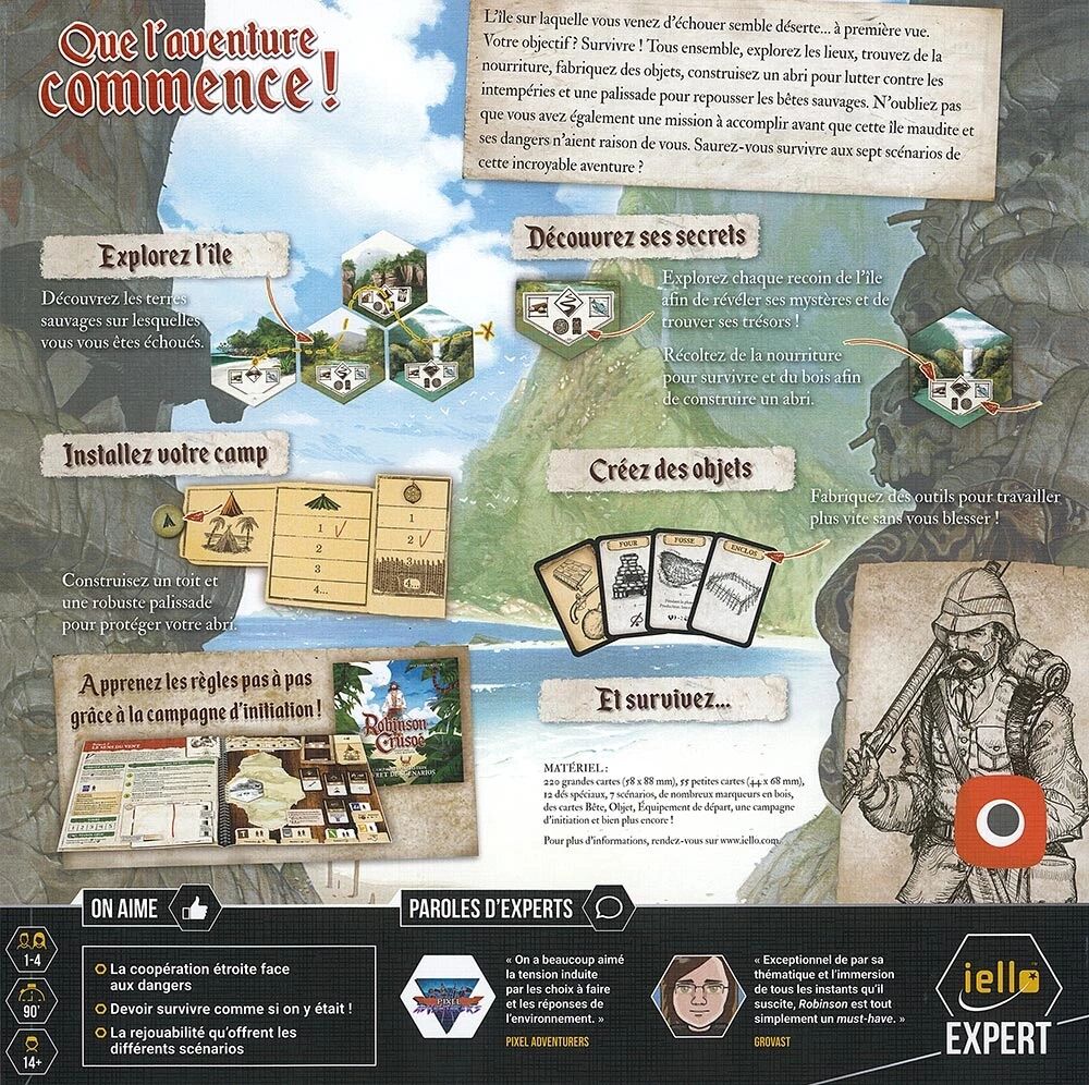 Sur l’île, vous devrez construire des murs autour de votre abri, domestiquer des animaux, fabriquer des armes et des outils à partir de ce que vous trouvez, et bien d’autres surprises encore vous attendent. Vous décidez de l’orientation du jeu et, après plusieurs semaines de travail acharné, de l’aspect de votre village. Parviendrez-vous entre-temps à découvrir le secret de l’île ? Trouverez-vous un trésor de pirates ou un village abandonné ? Découvrirez-vous une cité souterraine ou un temple maudit au fond d’un volcan ? Les réponses à ces questions se trouvent dans des centaines de cartes d’événements et des centaines de cartes d’objets et de structures qui peuvent être utilisées au cours du jeu…