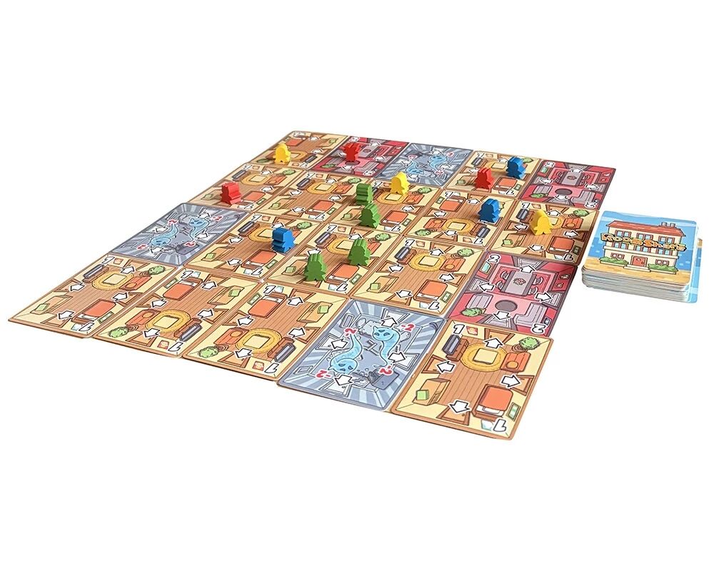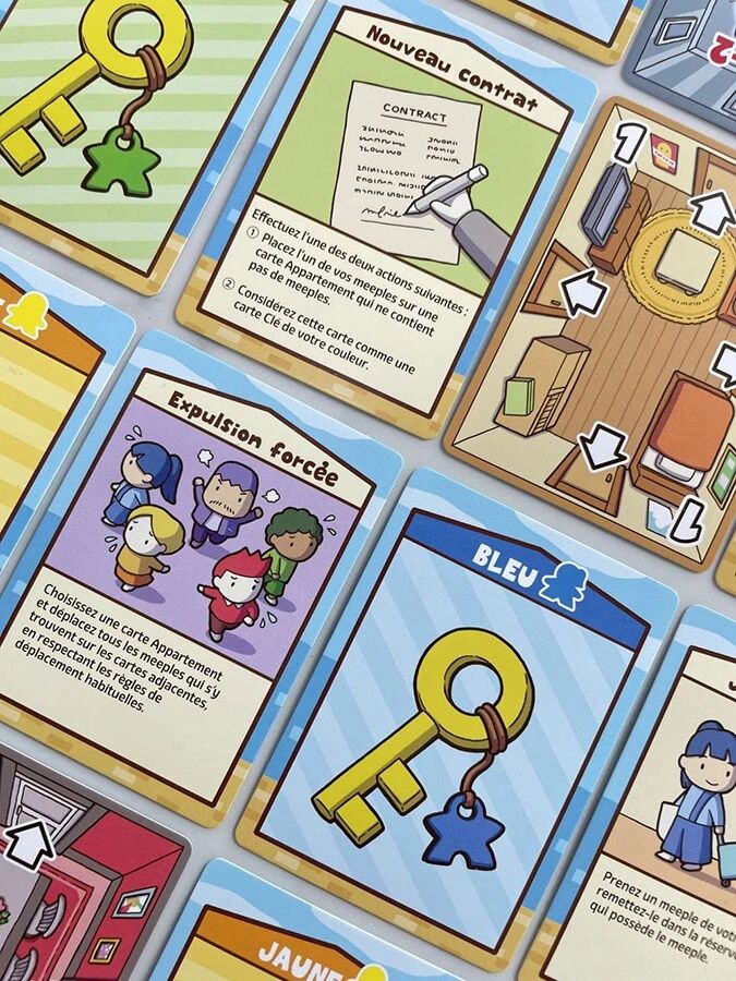 À chaque tour, vous jouez une carte Événement qui modifie la configuration du plateau : réorganisez les chambres, déplacez vos meeples ou provoquez des expulsions bien senties pour gêner vos adversaires.