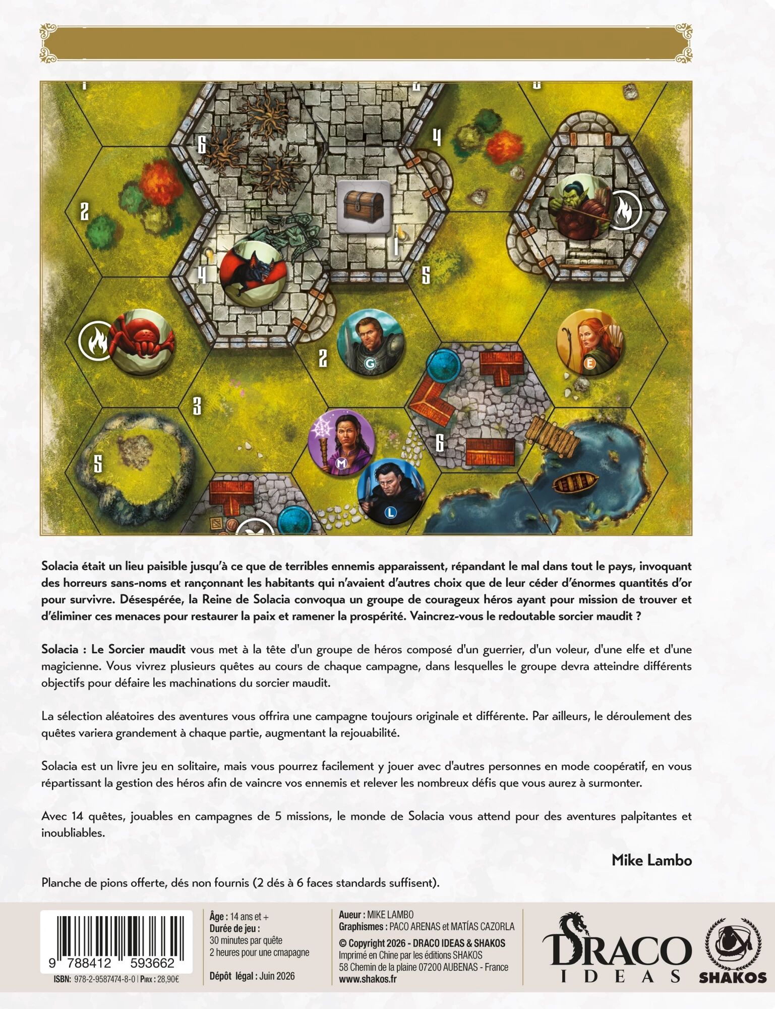 Dans le jeu Solacia, vous incarnez un groupe de héros aux compétences complémentaires - guerrier, voleur, elfe ou magicienne - plongés dans un univers médiéval-fantastique menacé par de puissantes forces obscures. Chaque boîte propose une campagne composée de 14 quêtes, organisées en missions successives, offrant une progression immersive et scénarisée.