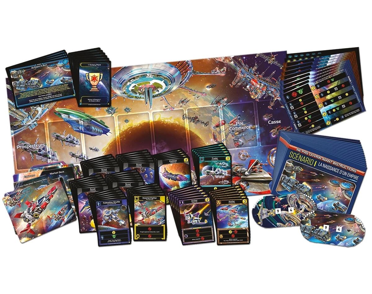 Cette fois encore, vous construisez votre deck en achetant de nouvelles cartes depuis la ligne de commerce. Les cartes produisent du Commerce pour recruter, du Combat pour attaquer et de l’Influence pour survivre. Les synergies entre factions permettent de déclencher des effets puissants et d’accélérer votre montée en puissance.