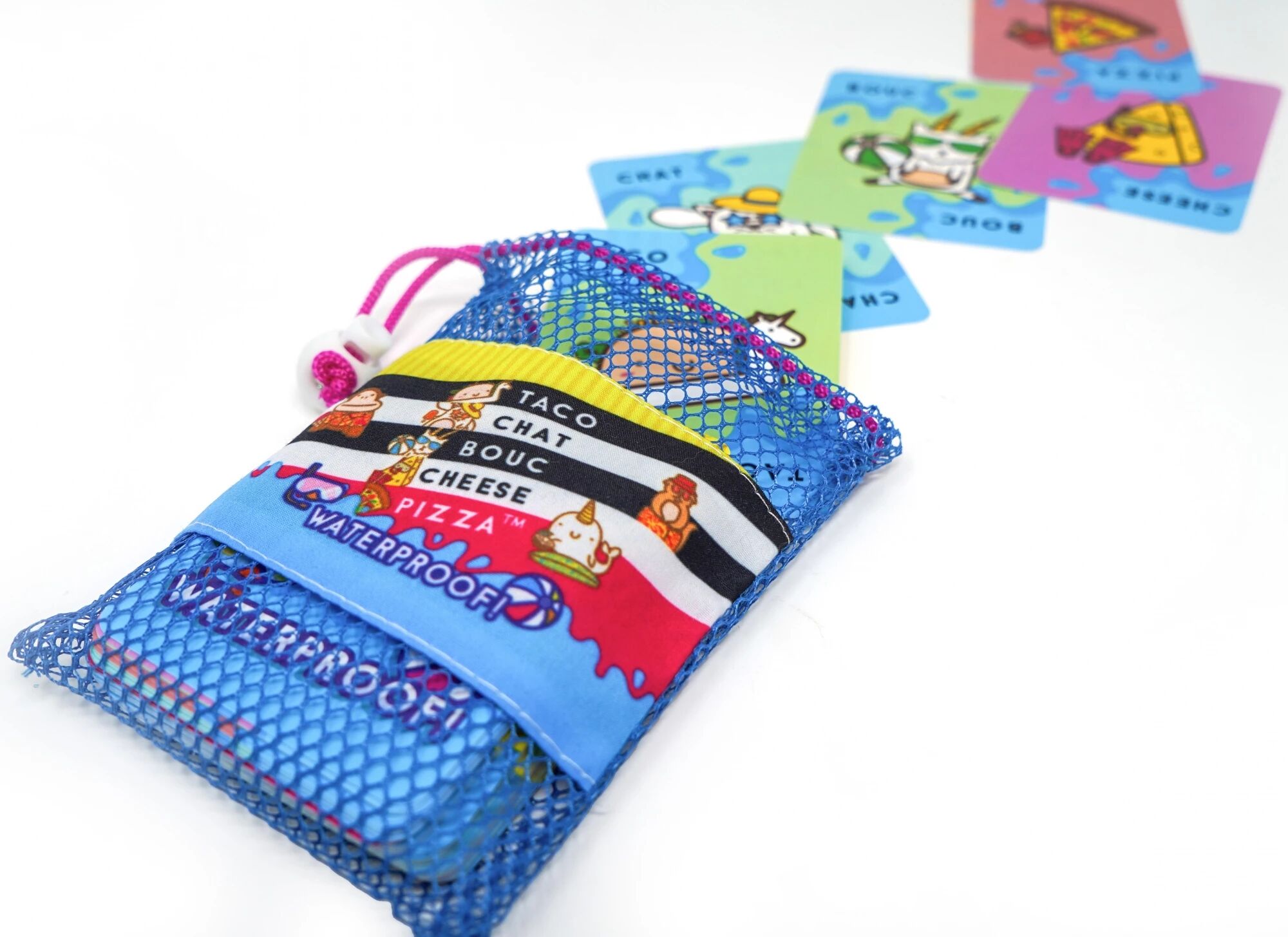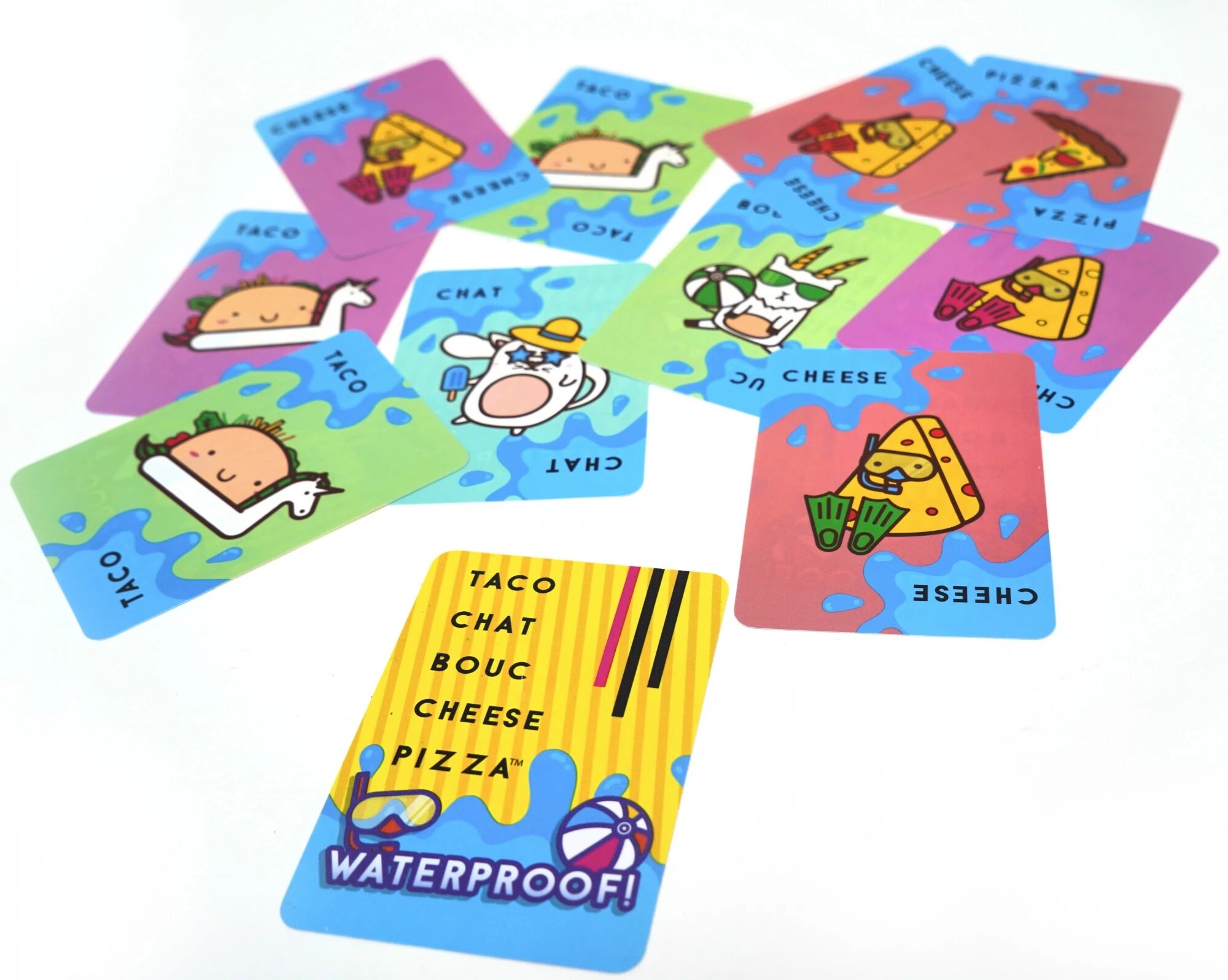 Le jeu Taco Chat Bouc Cheese Pizza Waterproof reprend exactement tout ce qui a fait le succès de Taco Chat Bouc Cheese Pizza mais en version résistante à l’eau ! Oui, c’est le même jeu d’ambiance hilarant, la même mécanique addictive, les mêmes éclats de rire.. Simplement prêt à survivre aux verres renversés, aux parties en extérieur ou aux après-midis piscine !