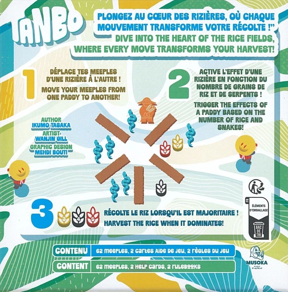 Dans Tanbo, chaque joueur incarne un riziculteur ou une rizicultrice et doit optimiser ses récoltes. Plus les serpents sont nombreux dans vos rizières, plus elles sont fertiles. Mais attention : trop de reptiles et vous ne pourrez plus récolter !