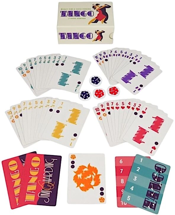Tango est un jeu de cartes pour 2 joueurs. Dans ce jeu de plis, chaque tour se joue avec quatre cartes : deux issues de la main des joueurs et deux provenant de cartes visibles sur la table. La couleur d’atout peut changer après chaque pli, modifiant en permanence les priorités de jeu et les choix tactiques qui s'offrent à vous. Pas après pas (de danse), serez-vous le maître de la piste ?