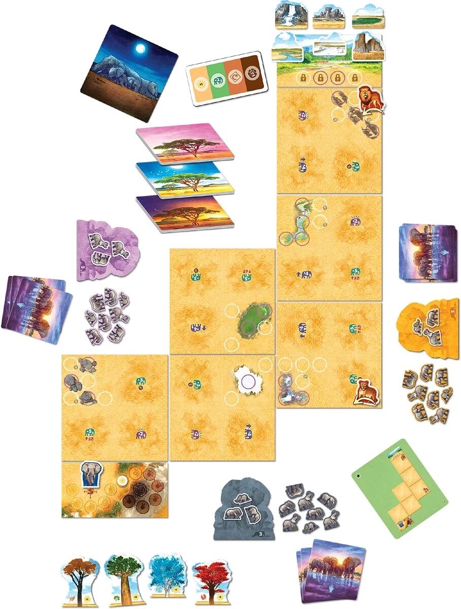 Chaque tour, vous devrez choisir entre deux actions principales : découvrir la savane en posant des cartes Terrain afin de déclencher des effets bénéfiques ou risqués, ou guider vos éléphants en formant des files respectant des motifs précis. La gestion des éléphants reposés et fatigués est au cœur du gameplay : mal anticiper peut rapidement bloquer le troupeau et précipiter la défaite. Les terrains spéciaux – points d’eau, arbres ou zones difficiles – apportent des opportunités tactiques mais demandent des ressources supplémentaires.