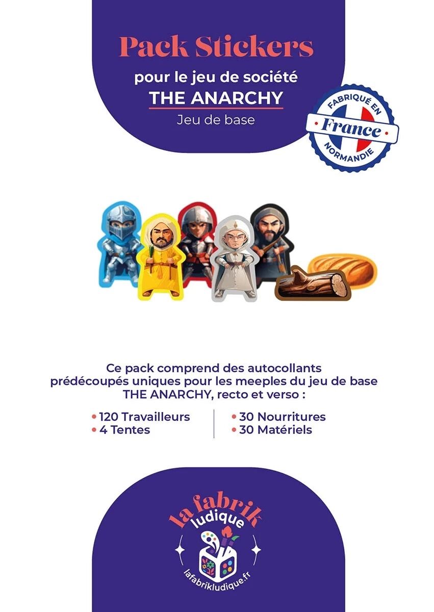Ajoutez du style et de la lisibilité à vos parties de The Anarchy grâce à ce pack de stickers conçu pour le jeu ! Chaque autocollant vient embellir les pions en bois pour une immersion renforcée.