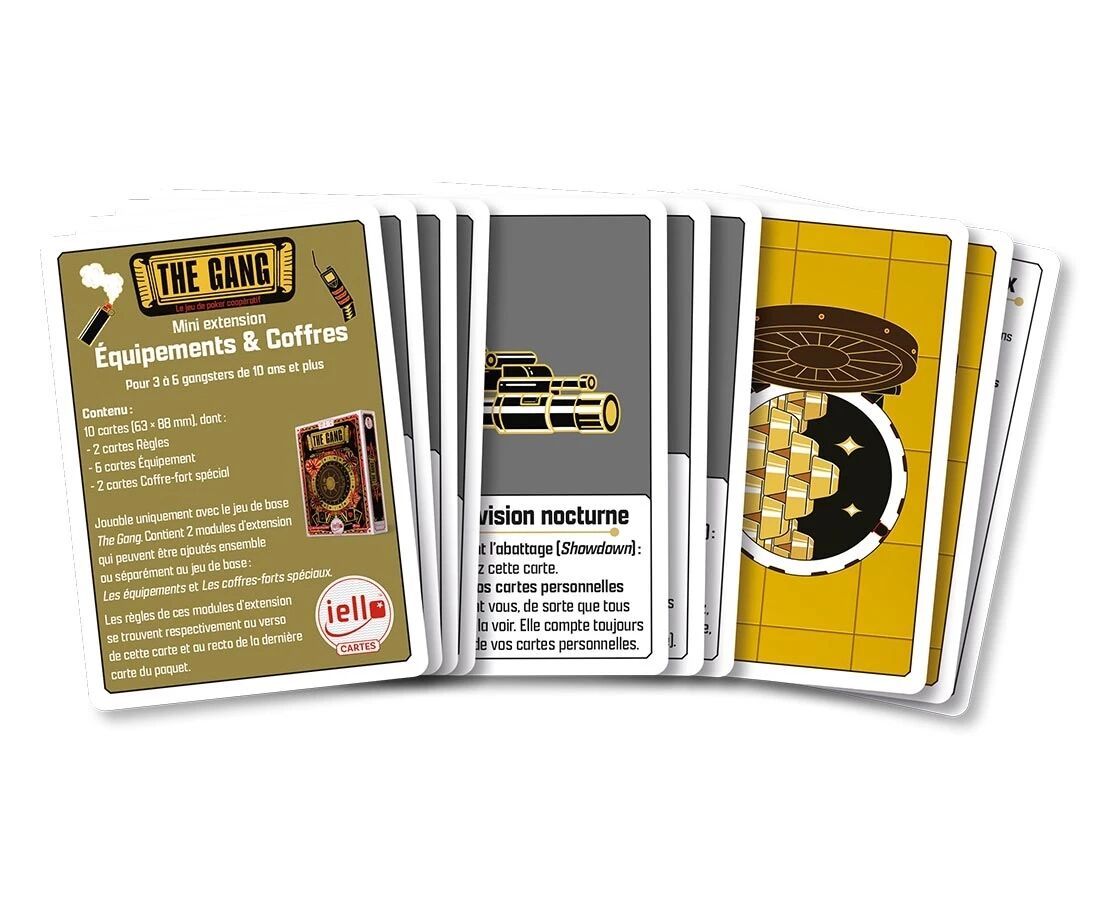 Cette mini-extension intitulée Équipements & Coffres pour le jeu The Gang enrichit le jeu de base avec deux modules indépendants, ajoutant de nouvelles cartes Équipement et des Coffres-forts spéciaux.