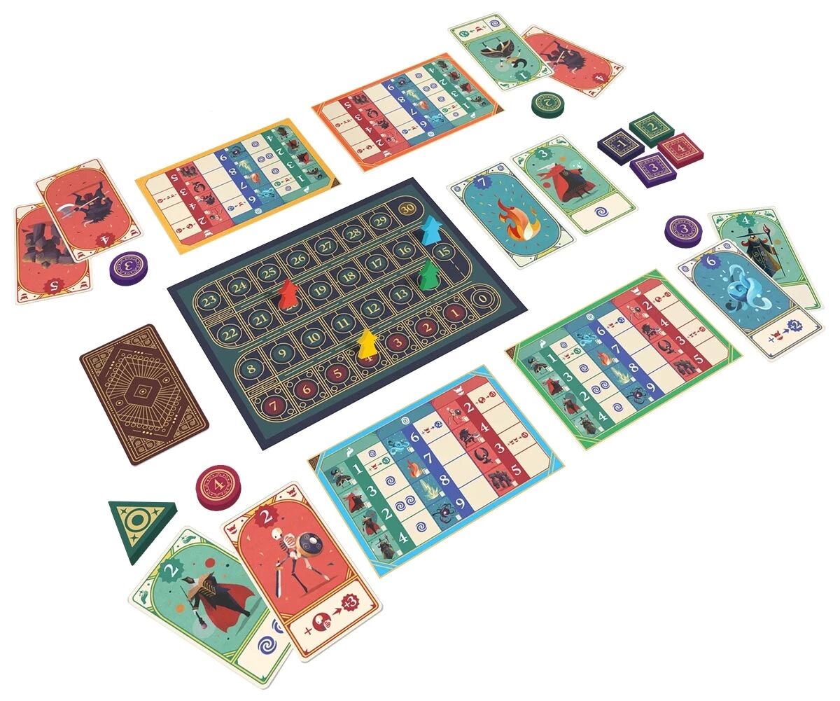 2 paquets de 18 cartes, 12 jetons de mise, 6 pions Mage, 6 aides de jeu, 1 plateau de score, 1 livret de règles.