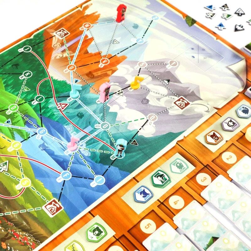 Le plateau central représente une montagne divisée en zones à explorer et à protéger. À chaque tour, chaque joueur dispose de missions à accomplir — observer des espèces, sécuriser des zones, réagir aux urgences — mais les joueurs doivent aussi patrouiller, collecter des outils, et remplir deux emplacements de mission personnelle. Le jeu repose sur un système de draft inversé : vous ne choisissez pas vos cartes, vous les distribuez aux autres ! Ainsi, chaque décision devient un acte de confiance, d’anticipation et de coordination.