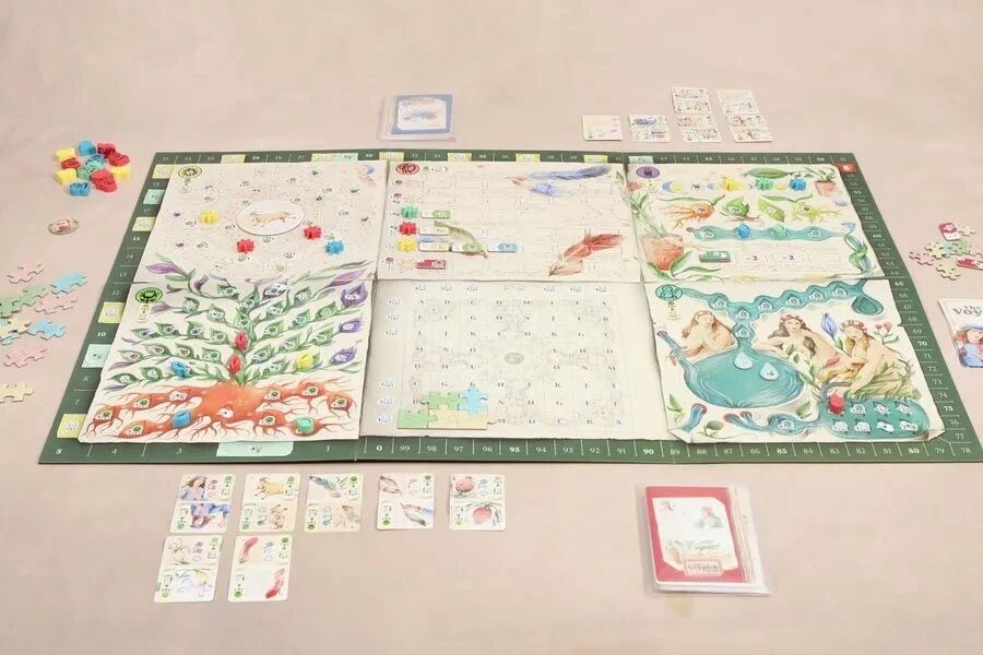 Chaque section du plateau propose une mécanique différente : faire pousser des plantes en Botanique, manipuler constellations et signes astrologiques, gérer les flux d’eau dans les Bains, décrypter des textes mystérieux ou combiner des éléments dans les Recettes. The Voynich Puzzle offre ainsi une grande richesse stratégique, mêlant optimisation, planification à long terme et course aux points de victoire.