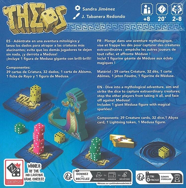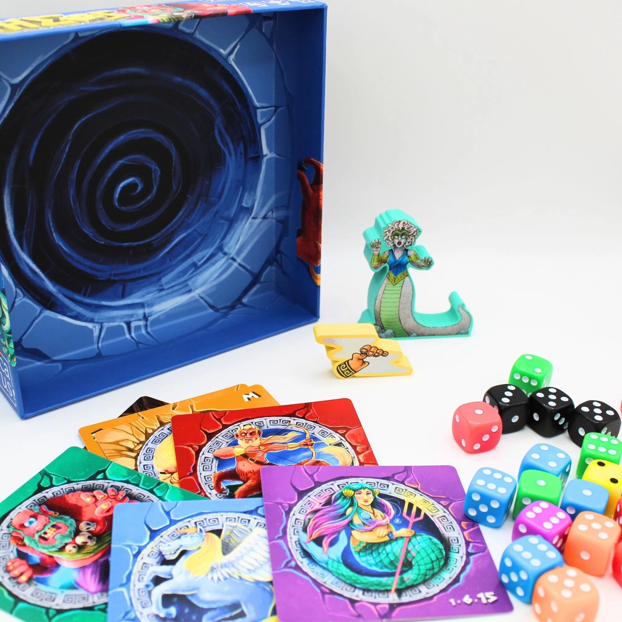 Dans le jeu Theos, vous incarnez une divinité grecque bien décidée à prouver sa supériorité. Au centre de la table, des cartes Créatures mythologiques sont disposées. Pour les capturer, vous devez taper sur votre tour de dés afin de projeter celui du sommet vers la zone de jeu.