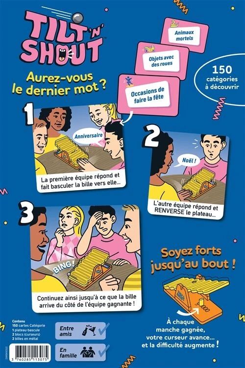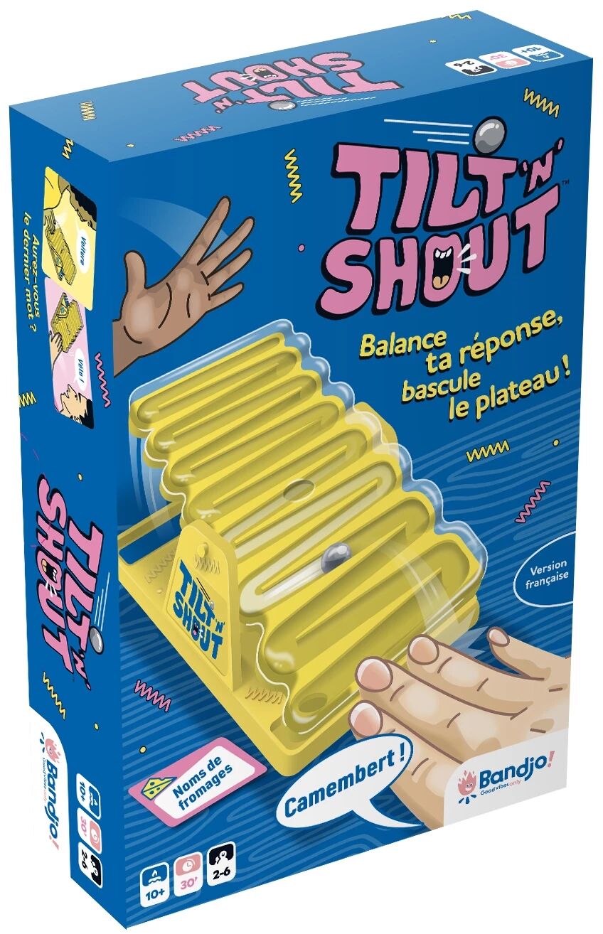 Avec le jeu Tilt 'N' Shout, préparez-vous à vivre des parties survoltées où chaque seconde compte. Ce jeu d’ambiance en équipe repose sur une idée très simple : trouver des réponses rapidement tout en manipulant un plateau-bascule pour garder la bille de votre côté.