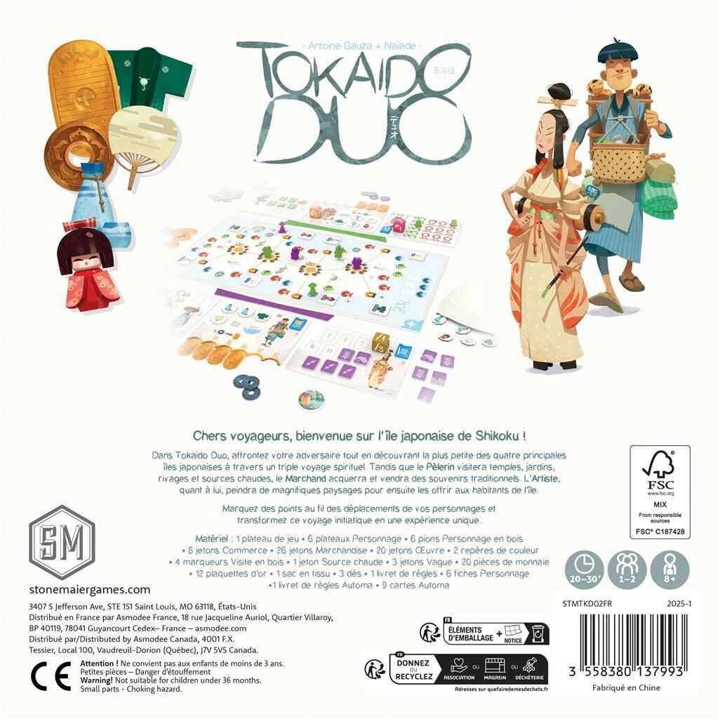 Dans le jeu Tokaido Duo, deux joueurs s’affrontent dans un duel stratégique élégant et contemplatif, au cœur d’un Japon apaisant et magnifiquement illustré. Chacun incarne un voyageur parcourant l’île de Shikoku, cherchant à vivre un périple initiatique riche en découvertes et en rencontres.