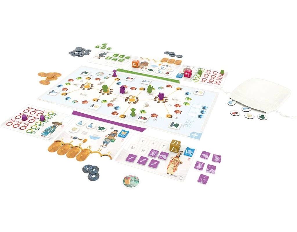 Chaque personnage propose une manière unique de marquer des points : le Pèlerin visite temples et jardins sacrés, le Marchand fait prospérer ses affaires le long des côtes, tandis que l’Artiste immortalise les paysages pour les offrir aux habitants. Cette asymétrie donne à chaque partie une identité propre et renouvelle les tactiques.