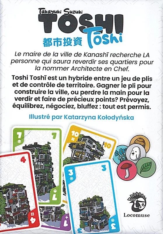 Dans Toshi Tōshi, chaque joueur ne joue qu’une seule main de 10 cartes, mais chaque pli est crucial. Le gagnant d’un pli détermine les bâtiments construits et bénéficie d’une action spéciale, tandis que les perdants placent des jetons de verdissement sur la grille pour revendiquer les édifices. La carte Monument au centre de la ville module la force des cartes et change la hiérarchie des plis, ajoutant une tension stratégique constante.