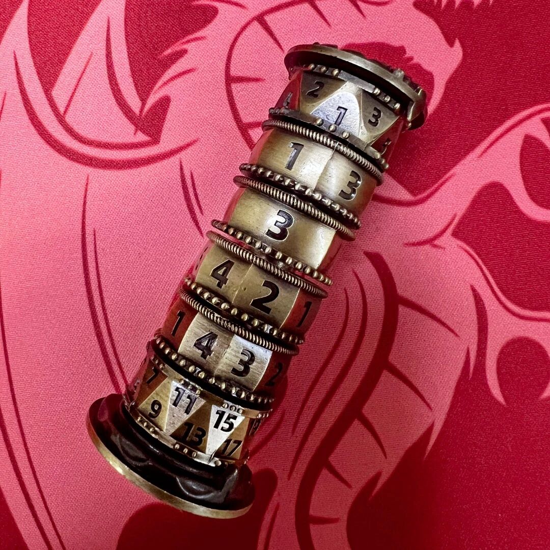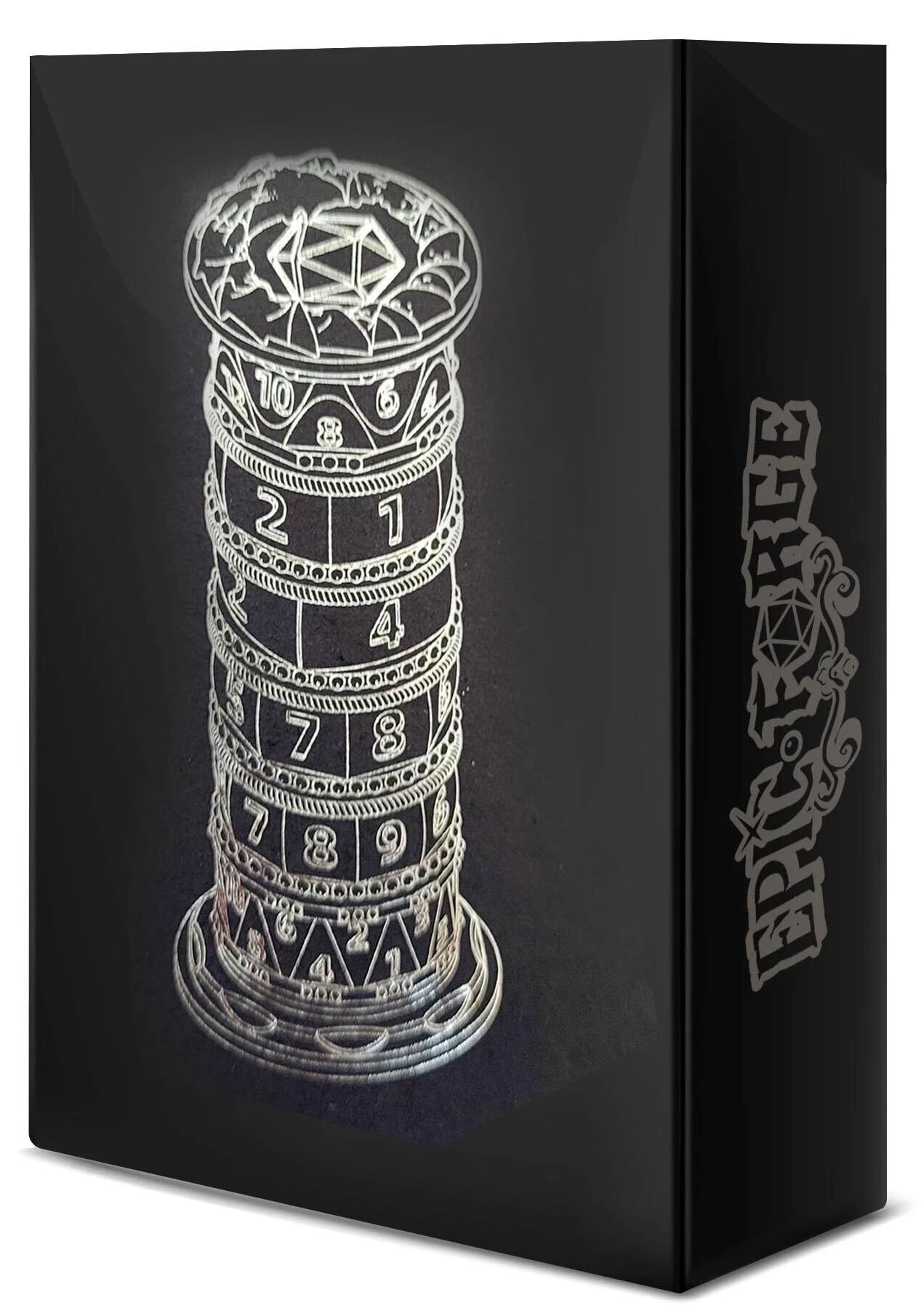 La tour intègre un set complet de dés RPG : D4, D6, D8, D10, D12, D20 et D100. Tous les dés sont déjà en place à l’intérieur du cylindre rotatif, prêts à l’usage pour une large variété de jeux de table.