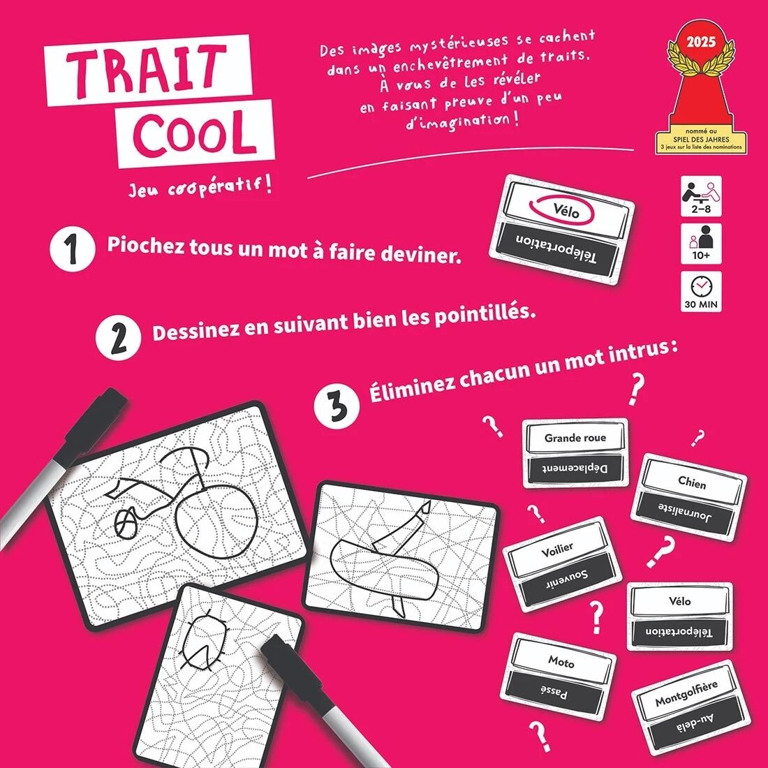 Chaque joueur pioche secrètement une carte Mot et doit représenter ce mot sur son ardoise, mais uniquement en suivant un enchevêtrement de lignes pointillées déjà tracées. Lever le feutre est autorisé, changer d’orientation aussi, mais écrire est strictement interdit. Cette limitation transforme chaque dessin en véritable casse-tête graphique où l’imagination fait toute la différence.