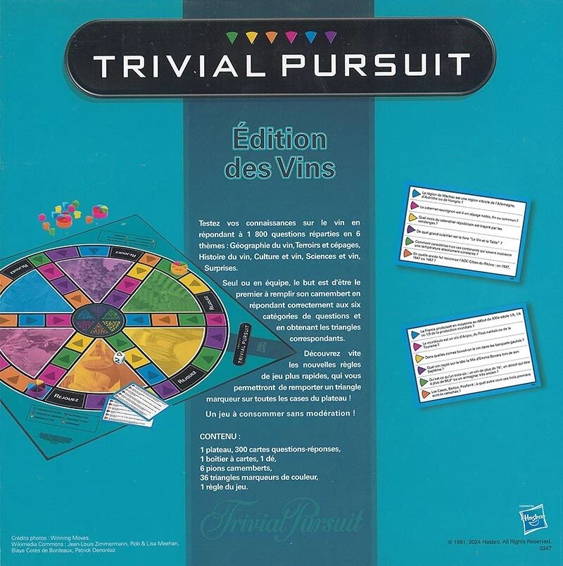 Testez vos connaissances sur le vin et épatez vos amis avec ce Trivial Pursuit de 1800 questions réparties en 6 catégories : géographie du vin, terroirs et cépages, histoire du vin, culture et vin, sciences et vin et une catégorie “surprise”.