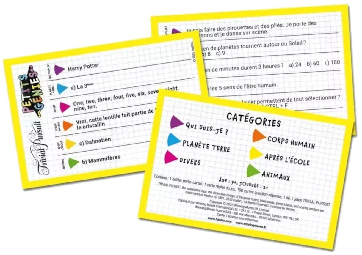 Avec Trivial Pursuit : Petits Génies (Édition Voyage), la célèbre formule du jeu de questions-réponses se décline dans une version pensée pour les enfants. Cette Édition Voyage propose un contenu adapté aux plus jeunes, avec 600 questions conçues pour stimuler leur curiosité, leur mémoire et leur envie d’apprendre en s’amusant. Le principe reste simple : répondre à des questions dans différentes catégories et progresser grâce à ses bonnes réponses.