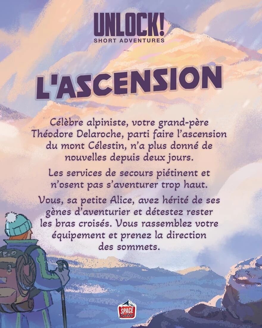 Les services de secours n'osent pas s'aventurer à sa recherche. À vous, qui avait hérité de ses gènes d'aventurier, de prendre la direction des sommets. Cette aventure de niveau de difficulté 2 convient aux novices comme aux joueurs plus expérimentés.