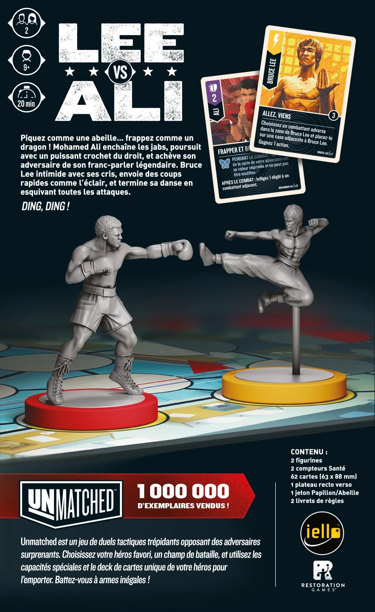 Le jeu Unmatched - Bruce Lee Vs Mohammed Ali est une boîte indépendante de la célèbre gamme Unmatched. Contre n’importe qui, n’importe où. Unmatched, ce sont des duels tactiques rapides, féroces et asymétriques, champion contre champion. Choisissez votre héros, déterminez un champ de bataille, puis utilisez votre deck et vos capacités spéciales pour l'emporter.
