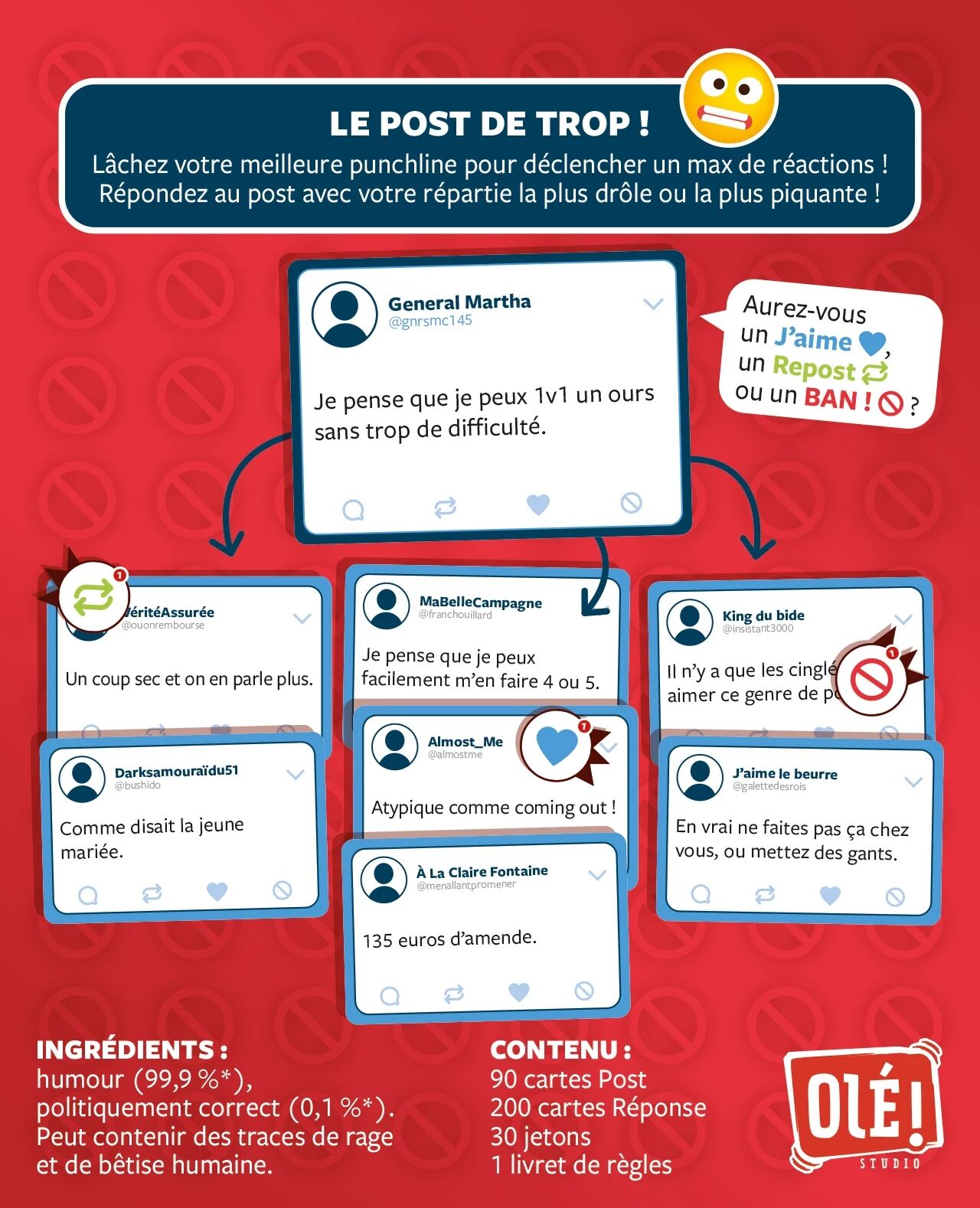 Le Juge attribue ensuite ses trois réactions : un J’aime pour une réponse qui l’a fait rire, un Repost pour celle qu’il voudrait partager, et un BAN ! pour la réponse jugée trop excessive… ou trop absurde. Chaque jeton rapporte des points et influence le résultat final. Dans Va te faire ban !, il n’y a pas d’ordre de tour : le jeu favorise les interactions directes, les surenchères et les improvisations inattendues