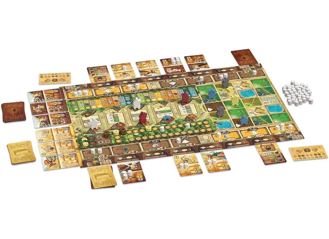 La partie se déroule sur deux années, rythmées par les saisons. Au printemps et en automne, vous envoyez vos ouvriers récolter des ingrédients sur un plateau commun composé de parcelles. Chaque ouvrier est lié à celui de votre adversaire par sa couleur : choisir un travailleur impose le choix du même à l’autre joueur au tour suivant. Selon le type de carte Logement activée (Travail d’équipe ou Labeur solitaire), vous optimisez différemment la production de raisins, lait, sel, sucre, levure ou ferments.