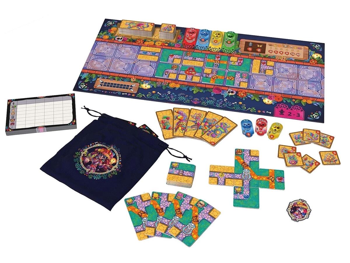 -1 plateau recto/verso - 6 tuiles Départ - 114 tuiles Chemin - 16 tuiles Ballons - 27 tuiles Chimère - 1 pion Catrina - 1 sac en tissu - 1 carnet de score - 1 livret de règles - 1 feuillet explicatif