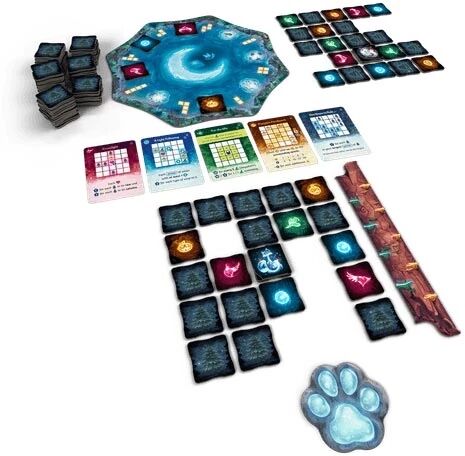Le cœur de la mécanique repose sur la pose de tuiles Forêt qui s’imbriquent pour former un paysage enchanteur. Les joueurs y ajoutent ensuite des tours en bois, symboles de leur pouvoir grandissant, et collectent les feux follets étincelants qui apportent des bonus.