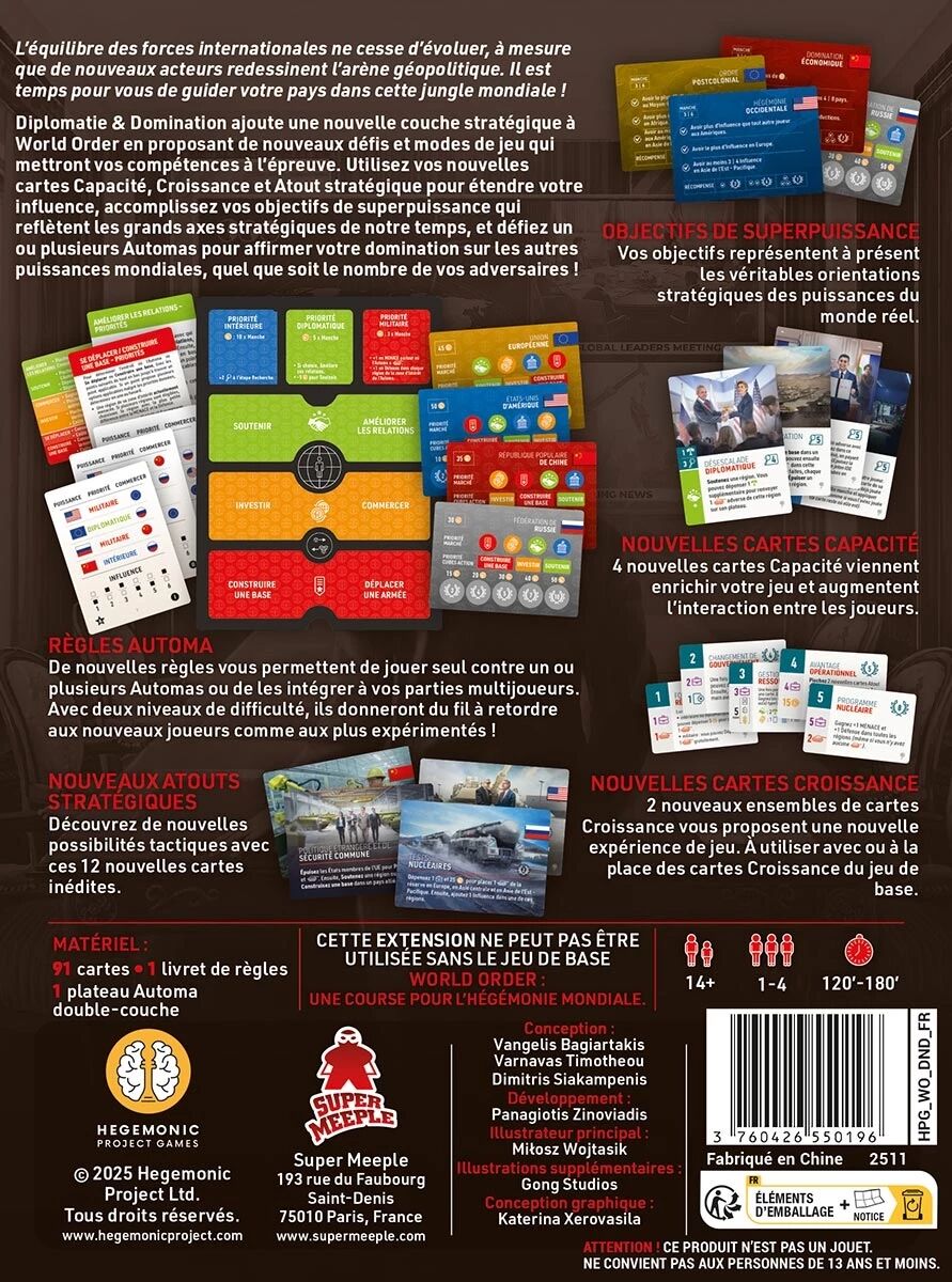 L'extension Diplomatie & Domination ajoute une nouvelle couche stratégique à World Order en proposant de nouveaux défis et modes de jeu qui mettront vos compétences à l’épreuve. Utilisez vos nouvelles cartes Capacité, Croissance et Atout stratégique pour étendre votre influence, accomplissez vos objectifs de superpuissance qui reflètent les grands axes stratégiques de notre temps.
