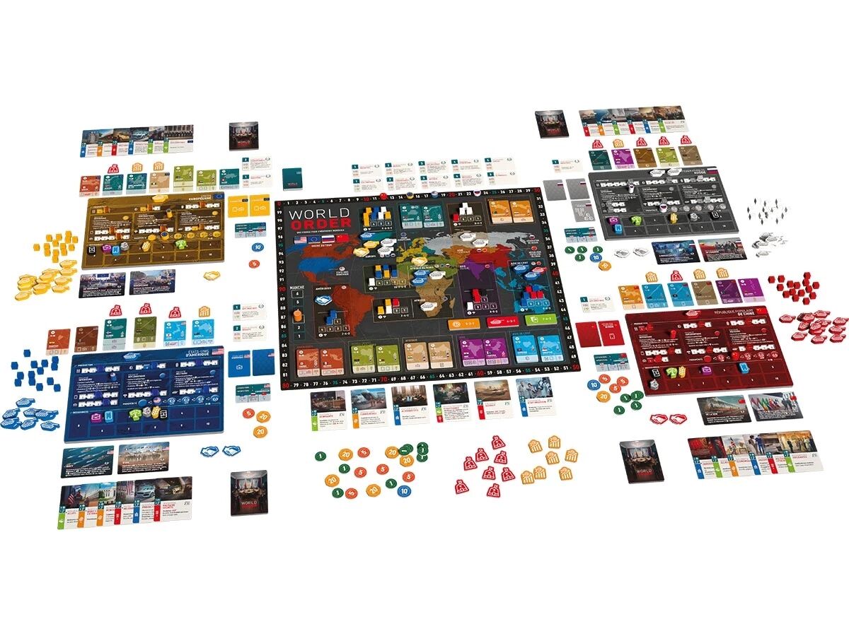 Les mécaniques d’influence sont au cœur de l’expérience. Dans World Order, chaque région du monde devient un champ de bataille politique où le placement de cubes, la gestion des majorités et le timing des scores sont cruciaux. Les alliances avec les pays secondaires, la construction de bases militaires ou encore les investissements directs étrangers créent des choix tactiques permanents et une interaction très forte entre les joueurs.