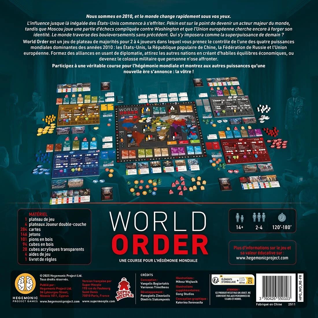 Grâce à son asymétrie marquée, sa grande profondeur stratégique et sa rejouabilité élevée, le jeu World Order offre des parties tendues, immersives et hautement interactives. Chaque décision compte, chaque action peut faire basculer l’équilibre mondial. World Order s’adresse aux joueurs passionnés de jeux de société stratégiques, de géopolitique et de confrontations indirectes où l’influence se gagne autant autour de la table que sur le plateau.