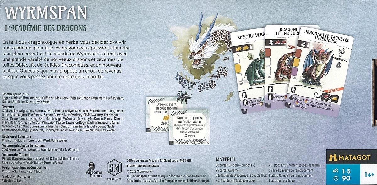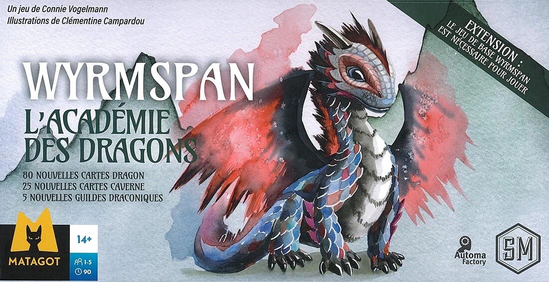 En plus de ces créatures inédites, L’Académie des Dragons enrichit l’expérience de Wyrmspan avec une grande variété de nouvelles cartes de dragons et cavernes, des tuiles Objectifs revisitées, et l’ajout des Guildes Draconiques qui diversifient les approches stratégiques. Un nouveau plateau Objectifs fait également son apparition : il offre désormais un choix de revenus alternatifs lorsque vous choisissez de passer pour le reste de la manche, ajoutant de la flexibilité et de la profondeur tactique à vos parties.