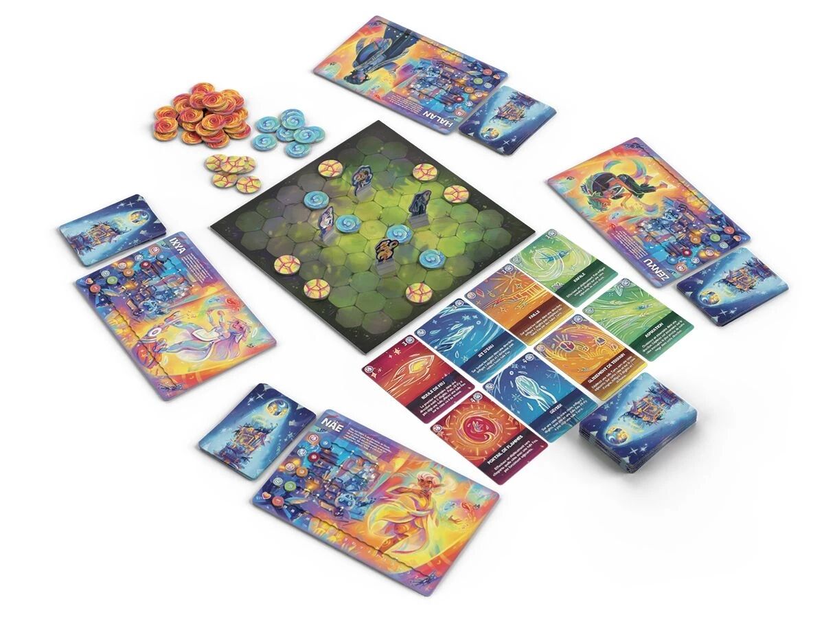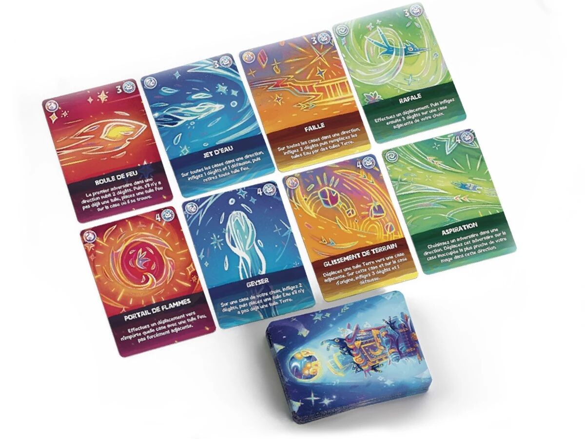 1 plateau de jeu, 4 plateaux mage, 4 figurines, 54 tuiles élémentaires, 20 jetons, 70 cartes de sorts, 4 aides de jeu